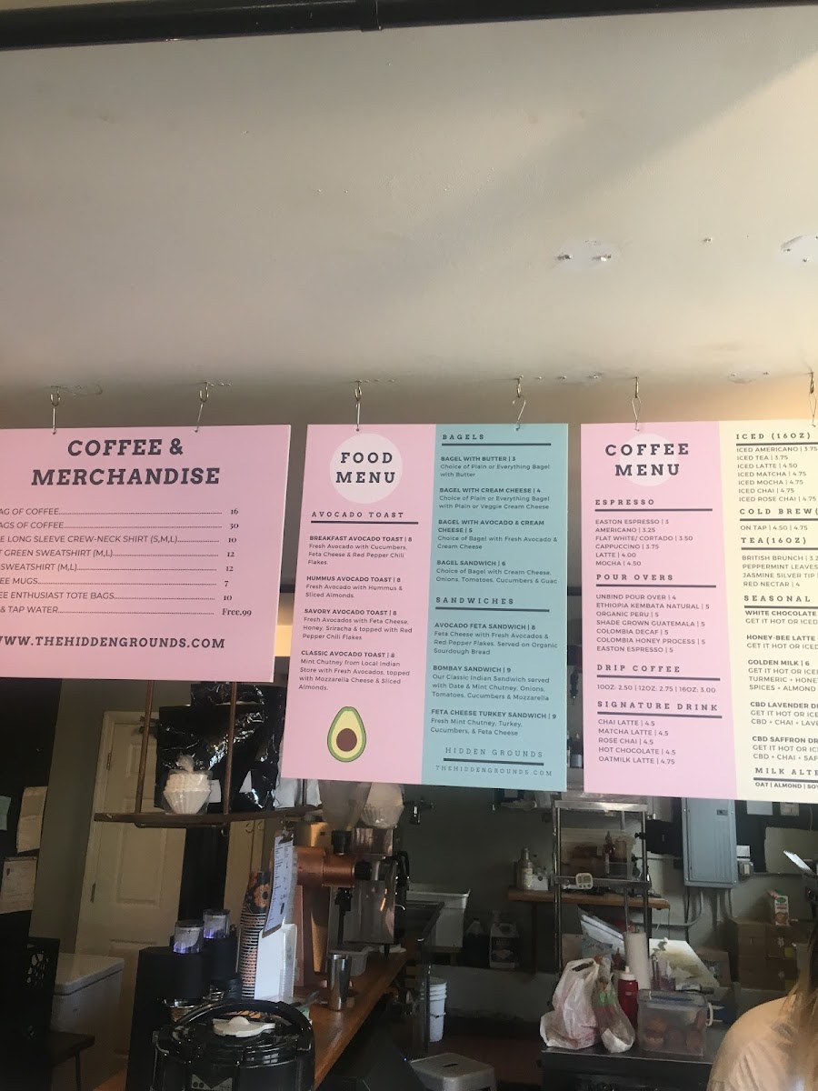 “ I experience good customer service at Hidden Grounds Coffee; an employee helps me uncover a Vegan option which tastes SO good (like, every bite good). The Mint Chutney, the Date Chutney, and Sriracha sauce make the Bombay Bagel sooo much more flavorful. The tomatoes, cucumber, and onion add a crunch as well as tame the Avocado (which is not slimy or at least not noticeably slimy due to the tomatoes, cucumber, and avocado). The Everything Bagel is my top choice for bagel options, and it tastes very good with these ingredients. The establishment is cute, literally underground like, at a corner, that if for not walking close to the corner, I'll have a lesser chance of finding the eatery. The eatery accepts all forms of payment. The establishment has WiFi and areas to charge electronics! ”